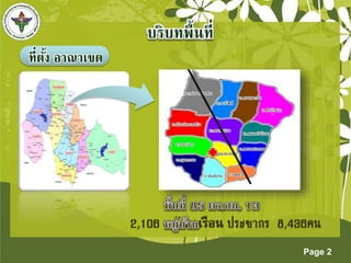 5 5 5 20 2. โรคเบำหวำนและ 5 5 4 4 18 ควำมดันโลหิตสูง Page 7 3. โรคมะเร็งเต้ำนม และมะเร็ง ปำกมดลูก 4 4 3 3 14 4. กำรคุ้มครอง ผ้บูริโภค 3 3 3 3 12 5. สร้ำงเสริมสุขภำพ 3 3 3 3 12