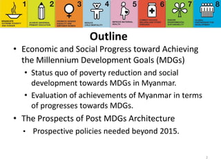 The document evaluates Myanmar's progress toward achieving the Millennium Development Goals (MDGs), highlighting challenges such as poverty reduction, education access, and gender equality. Key areas of concern include high poverty rates, educational enrollment gaps, and slow improvements in maternal and child health. It also outlines prospective policies needed beyond 2015 to sustain and expand on these achievements.