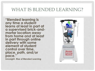 Blended learning combines online and in-person learning, allowing students some control over the time, place, path, and pace of their education. It provides advantages like personalized learning and increased engagement through tools like videos, discussions, and Google Docs. Teachers guide students and help develop their skills in blended classrooms. Role playing involves students assuming roles to practice skills and look at situations from different perspectives. It actively engages students, allows them to make real-world connections, and helps them appreciate different points of view. For role playing to be effective, clear expectations and feedback are needed to create a comfortable learning environment.