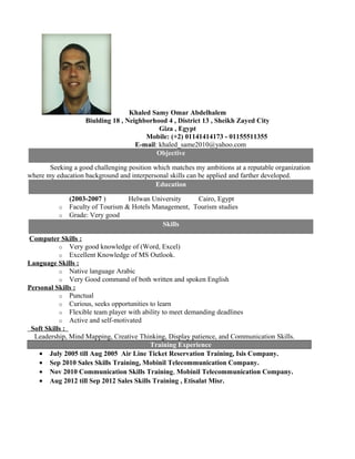 This document contains a resume for Khaled Samy Omar Abdelhalem. It lists his contact information, objective of seeking a challenging position matching his education and skills, education in tourism and hotel management, computer and language skills, and work experience including his current role as Assistant Store Manager for Protect Me Egypt and previous roles in sales and customer service for telecommunications companies. It provides details of his responsibilities, achievements, and training in each role.
