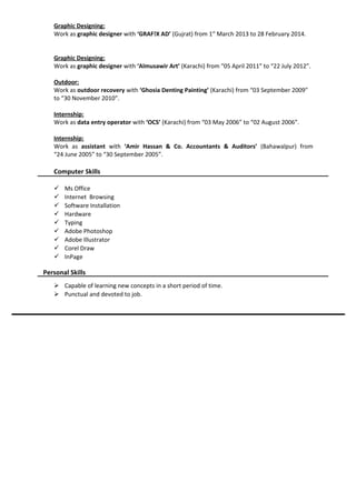This curriculum vitae is for Khalid Saud. He has a career objective of seeking a challenging position. His education includes an M.A. in Economics from Federal Urdu University Karachi in 2011. He has over 5 years of experience in graphic design, having worked at various companies in Karachi and Gujrat. His skills include Adobe Photoshop, Illustrator, Corel Draw, InPage, MS Office, and hardware and software installation. He aims to learn new concepts quickly and is punctual and devoted to his work.