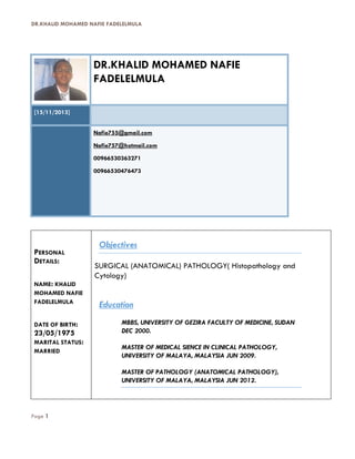 This document contains personal and professional details of Dr. Khalid Mohamed Nafie Fadelelmula. It outlines his education history including degrees in medicine from Sudan and masters degrees from Malaysia. It also provides a detailed employment history working as a pathologist and doctor in Sudan, Malaysia, Saudi Arabia, and the UAE. His roles have included interpreting surgical pathology samples, performing autopsies, and teaching. The document also lists his medical licenses and training including passing the first part of the FRCPath exam from the UK.