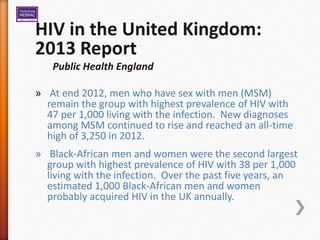 The document summarizes HIV statistics in the UK. It reports that in 2012, men who have sex with men (MSM) had the highest HIV prevalence rate at 47 per 1,000 people. New HIV diagnoses among MSM reached a record high of 3,250 that year. Black African men and women had the second highest prevalence rate at 38 per 1,000. An estimated 1,000 Black African people acquired HIV in the UK annually over the past five years.