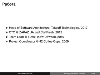 Документ обсуждает коллаборативные системы и типы данных, не допускающие конфликтов, включая различные модели консистентности и стратегии репликации. Максим Климишн делится опытом работы с распределёнными приложениями, группами и инструментами для совместного редактирования, а также рассматривает примеры таких систем, как CRDT. Также представлены технологии и инструменты, используемые для реализации описанных концепций.