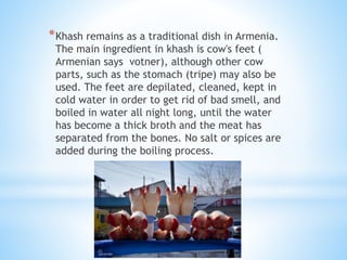 Khash remains a traditional dish in Armenia made primarily from cow's feet. The feet are cleaned, soaked in water to remove odors, and boiled overnight until the broth thickens and the meat separates from the bones without adding salt or spices. Khash is served hot with the option to add salt, garlic, lemon juice or vinegar to taste and is often eaten with lavash bread crumbled in the broth along with other sides like peppers, pickles, radishes, cheese and greens while accompanied by vodka and mineral water.