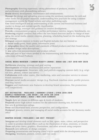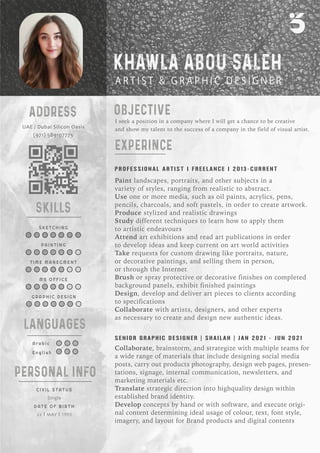 Khawla Abou Saleh is a graphic designer and artist based in Dubai. She has over 8 years of experience in graphic design, painting, and art instruction. Her skills include graphic design, painting, sketching, time management, and proficiency with software such as Photoshop, Illustrator, and Microsoft Office. She holds a Bachelor's degree in Archaeology and has taken courses in graphic design, drawing, and English. Her objective is to find a creative position in a company where she can contribute her artistic talents.