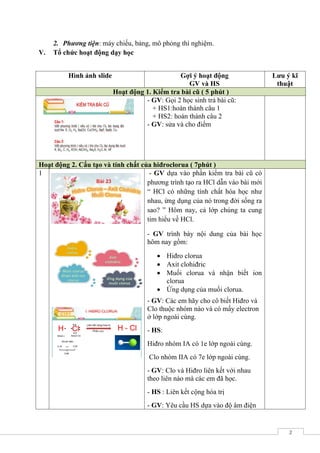Tài liệu là kế hoạch bài dạy về hiđroclorua, axit clohiđric và muối clorua, với mục tiêu giúp học sinh hiểu tính chất vật lý, hóa học và ứng dụng của chúng. Bài học bao gồm các hoạt động kiểm tra, thuyết trình, và thí nghiệm để rèn luyện kiến thức, kỹ năng và thái độ cho học sinh. Trọng tâm là tính chất hóa học của axit clohiđric và cách điều chế, nhận biết ion clorua.