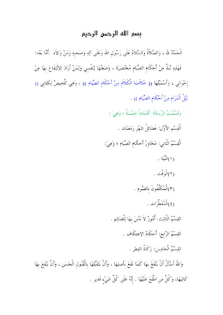 א ﺍﹾﻟﺤﻤﺪ ﷲ ، ﻭﺍﻟﺼﻼﺓ ﻭﺍﻟﺴﻼﻡ ﻋﻠﹶﻰ ﺭ ﻮﻝ ﺍﷲ ﻭﻋﻠﹶﻰ ﺁﻟﻪ ﻭﺻﺤﹺﺒﻪ ﻭﻣﻦ ﻭﺍﻻﹶﻩ ﹶﺃ ﺎ ﺑﻌﺪ: ﻣ ﹶ ﹸ ﹶ ﺳ ﹺ ﻓﻬﺬﻩ ﻧﺒﺬ ﻣﻦ ﹶﺃﺣﻜﹶﺎﻡ ﺍﻟﺼﻴﺎﻡ ﻣﺨﺘﺼﺮﺓ ، ﻭﺿﻌﺘﻬﺎ ﻟﻨﻔﺴِﻲ ﻭﻟﻤﻦ ﹶﺃﺭﺍﺩ ﺍﻻﻧﺘﻔﹶﺎﻉ ﹺﺑﻬﺎ ﻣﻦ ﹾ ﹶ ﹲ ﹺ ﹺ ﹺﺇﺧﻮﺍﻧﹺﻲ ، ﻭﹶﺃﺳﻤﻴﺘﻬﺎ )) ﺧﻼﺻﺔ ﺍﹾﻟﻜﻼﻡ ﻣﻦ ﹶﺃﺣﻜﹶﺎﻡ ﺍﻟﺼﻴﺎﻡ (( ، ﻭﻫﻲ ﺗﻠﺨﻴﺺ ﻟﻜﺘﺎﺑﹺﻲ )) ﹾ ﹶ ﹶﹺ ﹺ ﹶ ﻧﻴﻞ ﺍﹾﻟﻤﺮﺍﻡ ﻣﻦ ﹶﺃﺣﻜﺎﻡ ﺍﻟﺼﻴﺎﻡ (( . ﹸ ﹺ ﹶﹺ ﻭﻗﺴﻤﺖ ﺍﻟﺮﺳﺎﹶﻟﺔ ﺃﹶﻗﺴﺎﻣﺎ ﺧﻤﺴﺔ ؛ ﻭﻫﻲ : ﹰ ﹰ ﹶ ﹶ ﺍﹾﻟﻘﺴﻢ ﺍﻷ ﻝ: ﻓﻀﺎﺋﻞ ﺷﻬﺮ ﺭﻣﻀﺎﻥ . َﻭ ﹶ ﹸ ﹺ ﺍﹾﻟﻘﺴﻢ ﺍﻟﱠﺎﻧﹺﻲ: ﻣﺤﺎﻭﺭ ﺃﹶﺣﻜﹶﺎﻡ ﺍﻟﺼﻴﺎﻡ ؛ ﻭﻫﻲ: ﹺ ﺜ ﹺ )١(ﺍﻟﻨﻴﺔ . )٢(ﺍﹾﻟﻮﻗﹾﺖ . )٣(ﺍﹾﻟﻤﻜﻠ ﹸﻮﻥ ﺑﹺﺎﻟ ﻮﻡ . ﹶﱠﻔ ﹶ ﺼ )٤(ﺍﹾﻟﻤﻔﻄﺮﺍﺕ . ﹶ ﱢ ﺍﻟﻘﺴﻢ ﺍﻟﱠﺎﻟﺚ: ﹸﺃ ﻮﺭ ﻻ ﺑﺄﺱ ﹺﺑﻬﺎ ﻟﻠﺼﺎﺋﻢ . ﻣ ﹶ ﹾ ﺜ ﺍﻟﻘﺴﻢ ﺍﻟ ﺍﺑﹺﻊ: ﺃﹶﺣﻜﹶﺎﻡ ﺍﻻﻋﺘﻜﹶﺎﻑ . ﺮ ﺍﻟﻘﺴﻢ ﺍﹾﻟﺨﺎﻣﺲ: ﺯﻛﹶﺎﺓ ﺍﻟﻔﻄﺮ . ﹸ ﻭﺍﷲ ﹶﺃﺳﺄﻝ ﹶﺃﻥ ﻳﻨﻔﻊ ﹺﺑﻬﺎ ﻛﻤﺎ ﻧﻔﻊ ﹺﺑﺄﹶﺻﻠﻬﺎ ، ﻭﹶﺃﻥ ﻳﺘﻘﺒﻠﻬﺎ ﺑﹺﺎﹾﻟﻘﻮﻝ ﺍﹾﻟﺤﺴﻦ ، ﻭﹶﺃﻥ ﻳﻨﻔﻊ ﹺﺑﻬﺎ ﹾ ﹶ ﹾ ﹶ ﹶ ﹶﺒ ﹺ ﹶ ﹶ َ ﹶ ﹸ ﹾ ﹶ ﻛﹶﺎﺗﺒﻬﺎ، ﻭﻛﻞ ﻣﻦ ﺍﻃﻠﻊ ﻋﻠﻴﻬﺎ . ﹺﺇﻧﻪ ﻋﻠﹶﻰ ﻛﻞ ﺷﻲﺀ ﻗﺪﻳﺮ . ﹸ ﱢ ٍ ﹶ ﹸ ﱠ ﹺ ﱠﹶ ﹶ ١