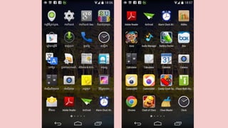 The document discusses the history and challenges of using the Khmer script with new technologies. It notes that the Khmer script was originally developed in the 3rd century and was influenced by Pallava script. When introduced to printing and computers in the 20th century, the Khmer script posed challenges due to its tall height compared to Latin scripts. Recent developments include UI fonts that reduce the height to allow more information display on small screens and harmonize with English text. Examples highlighted are Microsoft's Khmer UI, Noto Sans Khmer UI, and Samsung's Hanuman UI.