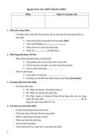 Tài liệu hướng dẫn sử dụng phần mềm PowerPoint cho người mới bắt đầu, bao gồm các thao tác khởi động, tạo, định dạng và trình chiếu bài thuyết trình. Nó cũng mô tả cách thêm màu sắc, hình ảnh và hiệu ứng động cho các trang chiếu, cũng như các lưu ý quan trọng khi tạo nội dung. Các bước thực hiện được sắp xếp một cách logic để người sử dụng dễ dàng làm theo.