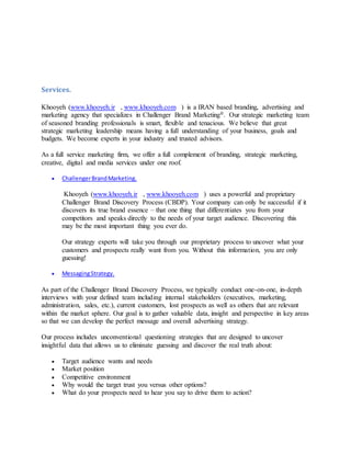 Khooyeh is an Iranian branding, advertising, and marketing agency that specializes in developing challenger brands. They offer a full range of services including brand strategy, messaging, creative services, digital marketing, social media marketing, integrated media strategies, public relations, and research. Khooyeh uses a proprietary Challenger Brand Discovery Process to thoroughly understand customers and develop differentiated brand messaging. Their goal is to help clients build brands that inspire, endure, and create a measurable competitive advantage.