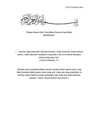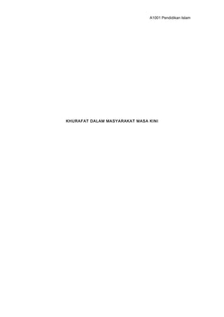 Dokumen tersebut membahas mengenai khurafat dalam masyarakat Islam masa kini. Ia menjelaskan bahwa khurafat berasal dari kepercayaan karut dan tahyul yang bercampur dengan ajaran Islam ketika agama ini diperkenalkan, seperti amalan meminta pertolongan makhluk ghaib. Dokumen tersebut juga menyebut beberapa contoh khurafat yang masih dipraktikkan seperti melenggang perut dan mandi Safar.
