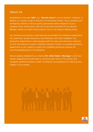 Khushi Chem, established in 1997, specializes in importing and supplying a diverse range of solvents and activated carbon, ensuring all products meet industry standards through stringent testing. The company offers a well-organized infrastructure for production, quality assurance, and client support, aiming to provide products at competitive prices. Led by manager Killol Modi, Khushi Chem focuses on maintaining high-quality standards and seeks to advance in the market.