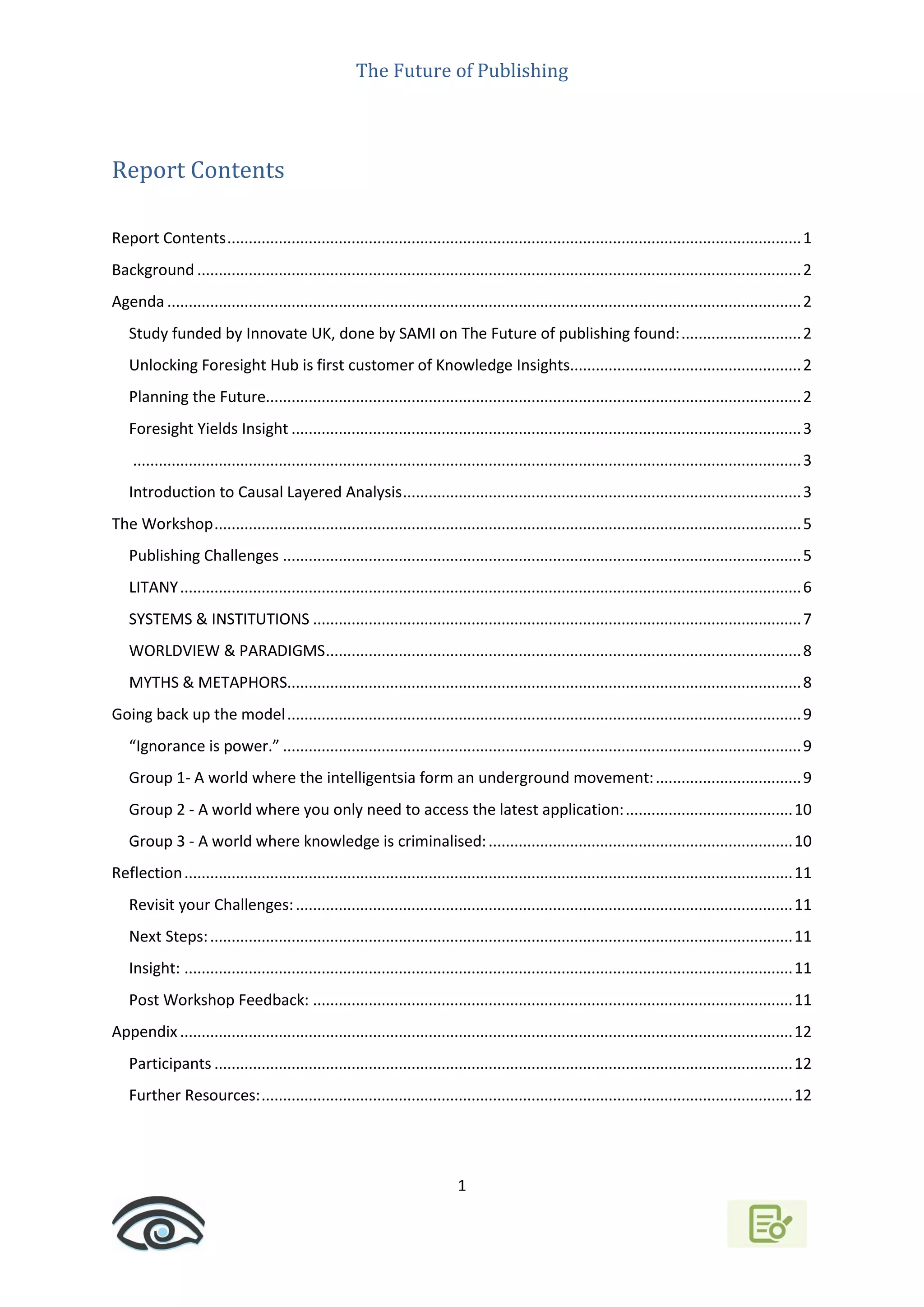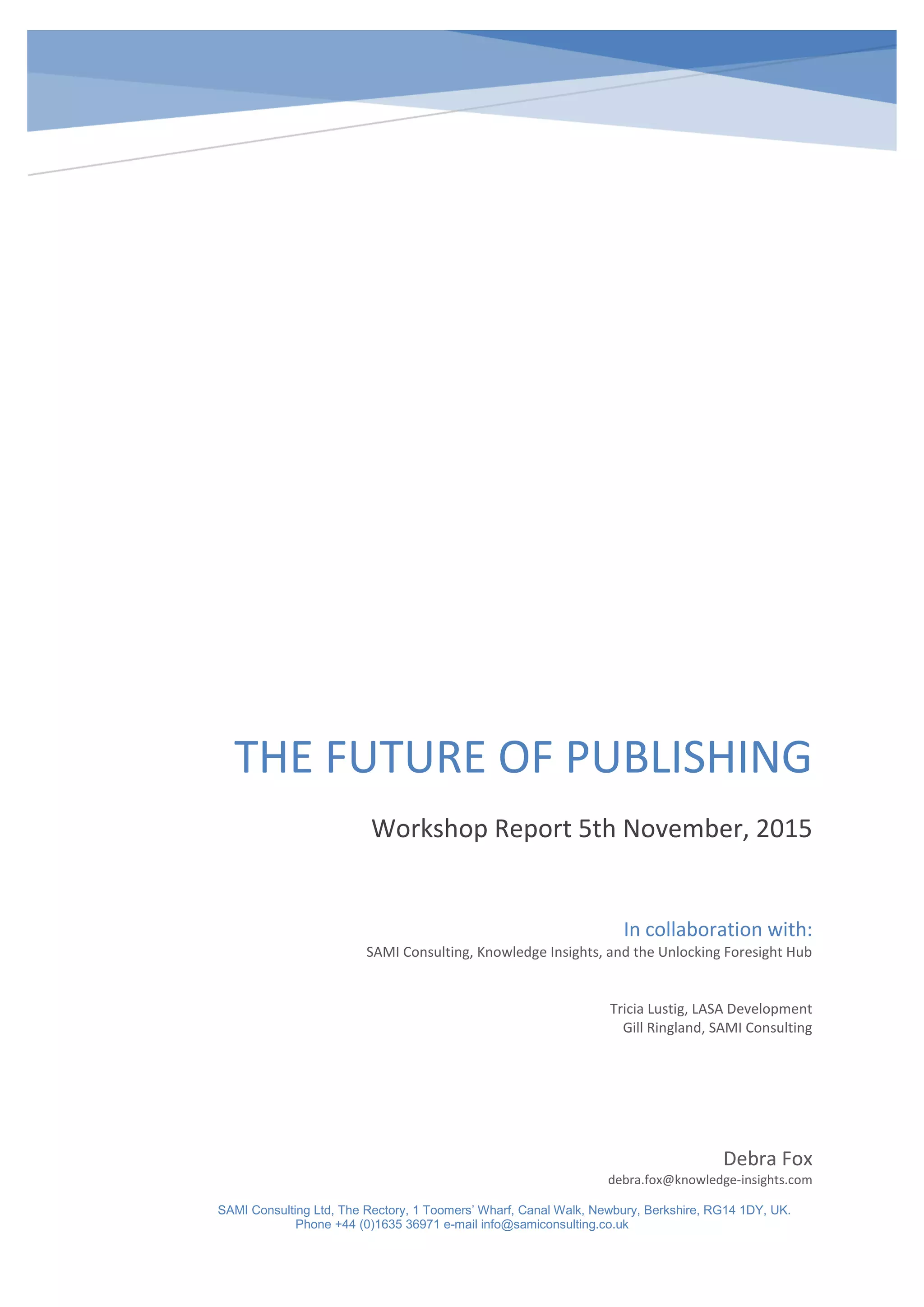 The document summarizes a workshop on the future of publishing that used causal layered analysis to explore challenges and paradigms. Key findings from a prior study on the future of publishing were presented. The workshop consisted of an introduction to causal layered analysis and its layers of litany, systems and institutions, worldviews, and myths/metaphors. Participants then used this framework to uncover existing paradigms and explore potential futures, identifying challenges around industry supply chains, the shift to digital content, translation, and making print less boring.
