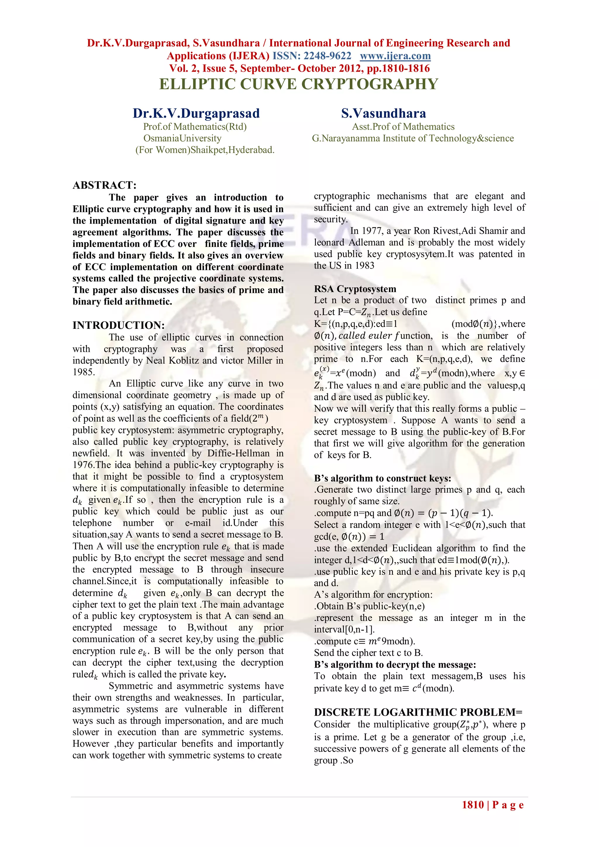 This document provides an introduction to elliptic curve cryptography. It discusses how elliptic curves can be used for digital signatures and key agreement. It also describes the implementation of elliptic curve cryptography over finite fields, prime fields, and binary fields. The document gives an overview of elliptic curve point addition and scalar multiplication. It explains the elliptic curve discrete logarithm problem, which the security of elliptic curve cryptography depends on.