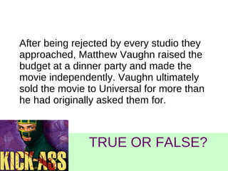 The document discusses the British film Kick Ass, including its production and promotion. It notes that after being rejected by studios, director Matthew Vaughn independently raised the budget and sold the film back to Universal for more than the original offer. While the film was considered a box office disappointment in the US, it was seen as a British film given its British director, writers, producer, actors and locations. The film references popular websites of the time and was screened at an annual film event in December 1999 to promote it.