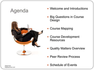 This document outlines an agenda for a course development kick-off meeting. The agenda includes introductions, discussions around big questions in course design, course mapping, available course development resources, an overview of the Quality Matters standards, and the peer review process. It also provides examples of course development projects and a schedule of events for the course development process.