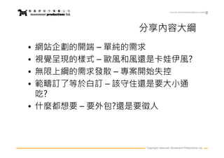 该文档探讨了项目策划过程中的挑战,强调了需求明确性和视觉表现的主观性。它分析了在项目启动后,需求可能失控以及应如何保持项目范围。文档还提及了公司为客户提供的各种服务,展示了公司在网站建设和多媒体制作方面的经验。