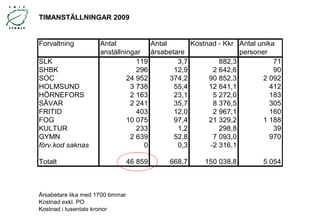 Organisation 1 jan2010 Socialnämnden Ordf Eva Andersson (s) Socialdirektör Ewa Klingefors Individ- och familjeomsorg Stefan Nybom 320 medarbetare Barn/unga Ann-Sofi Fahlén 170 medarbetare Begåvnings- handikapp Annette Johnsson 320 medarbetare Personlig assistans Pernilla Blomdahl 275 medarbetare Insatser för personer i eget boende Viviann Dannelöv 320 medarbetare Britta Edström UllaBritt Kullh Karin Söderberg Förebyggande insatser Utredning & bistånd för äldre och personer med funktionsned- sättning Katarina Jensstad 40 medarbetare Intraprenader Ledningskoordinator Dan Gideonsson Stab Katarina Jensstad UFFE Utvecklings- och fältforskningsenhet Ulf Hyvönen Totalt 830 medarbetare Insatser för personer i särskilt boende samt korttidsboende Insatser för personer med funktionsnedsättning