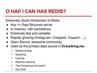 This document discusses using Redis to solve real world problems. It provides 4 patterns for using Redis: [1] as a simple, fast object store using hashes; [2] indexing objects with sorted sets; [3] using bitmaps for unique value counting; and [4] resolving locations with geohashing. Each pattern is explained and code examples are provided to illustrate how to model problems in Redis and leverage its data structures and performance. A variety of use cases are presented that can benefit from each pattern.