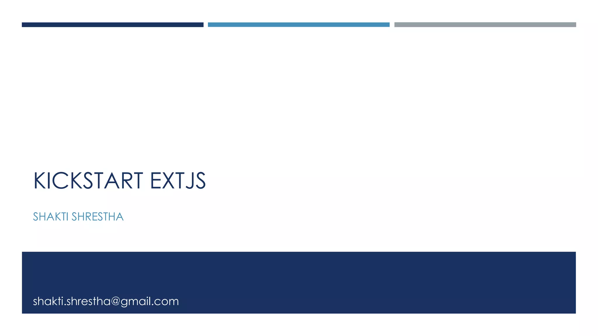The document provides an overview of ExtJS, a JavaScript framework. It discusses trends in JavaScript like single page applications and MVC architecture. It then defines ExtJS, noting it is an open source framework developed by Sencha with rich UI components and support for HTML5. Some key benefits of ExtJS are discussed, like cross-browser support, powerful build tools, and accessibility features. The document demonstrates a simple "Hello World" app in ExtJS and covers core concepts like components, data packages, layouts and containers. It also lists additional ExtJS topics like localization, drag and drop, theming and MVVM.