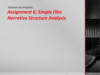 The film Kidulthood follows a conventional narrative structure with a beginning, middle, and end. In the beginning, we are introduced to the characters including Sam, who is established as the villain. The middle of the film shows increasing violence and conflict, as well as a teenage girl becoming pregnant. At the end, the pregnant girl's baby's father is beaten to death by Sam in a revenge attack, providing a climax with extreme violence.