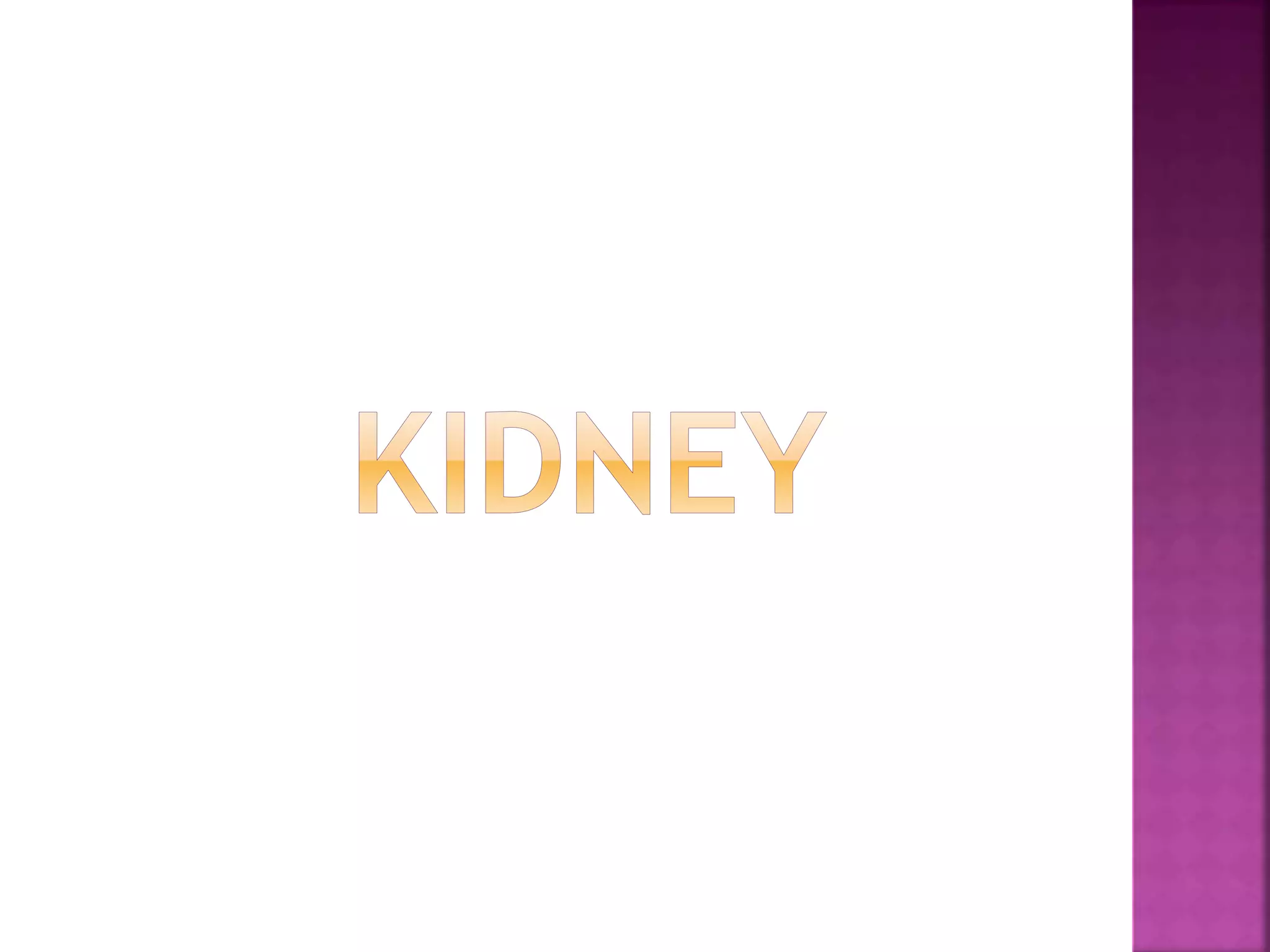 The kidneys are a pair of excretory organs located retroperitoneally on either side of the vertebral column. They remove waste and regulate water and electrolyte balance. Each kidney contains an inner medulla and outer cortex. The kidneys receive blood supply from the renal arteries and drain into the renal veins. They are important for regulating blood pressure and red blood cell production. Kidney diseases can cause hypertension, renal failure and require dialysis in severe cases.