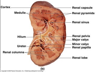 The urinary system consists of the kidneys, ureters, bladder, and urethra. The kidneys filter waste from the blood to produce urine. They contain millions of nephrons, the functional units of the kidney. Urine travels from the kidneys down the ureters to the bladder, where it is stored until urination. The urethra then carries urine out of the body. Each component plays an essential role in removing waste and regulating fluid balance.