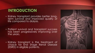 Kidney transplantation provides better long-term survival and quality of life than dialysis for patients with end-stage renal disease. While the first successful kidney transplants were between twins in 1954, transplantation techniques and anti-rejection drugs have improved outcomes over decades. Living donors are preferred as they offer reduced rejection rates and improved graft survival, though deceased donors also help many patients. Preemptive transplantation before dialysis starts provides the best results, but early transplantation once on dialysis also benefits patients.