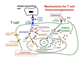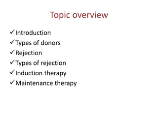 Kidney transplantation involves the surgical implantation of a healthy kidney into a patient with end-stage renal disease and can involve living or deceased donors. Successful transplantation relies on proper donor-recipient matching, which includes blood type and tissue typing, as well as management of potential rejection, which can occur in different forms post-surgery. Immunosuppressive therapies, including induction and maintenance therapies, are critical for preventing rejection and ensuring the success of the transplant.