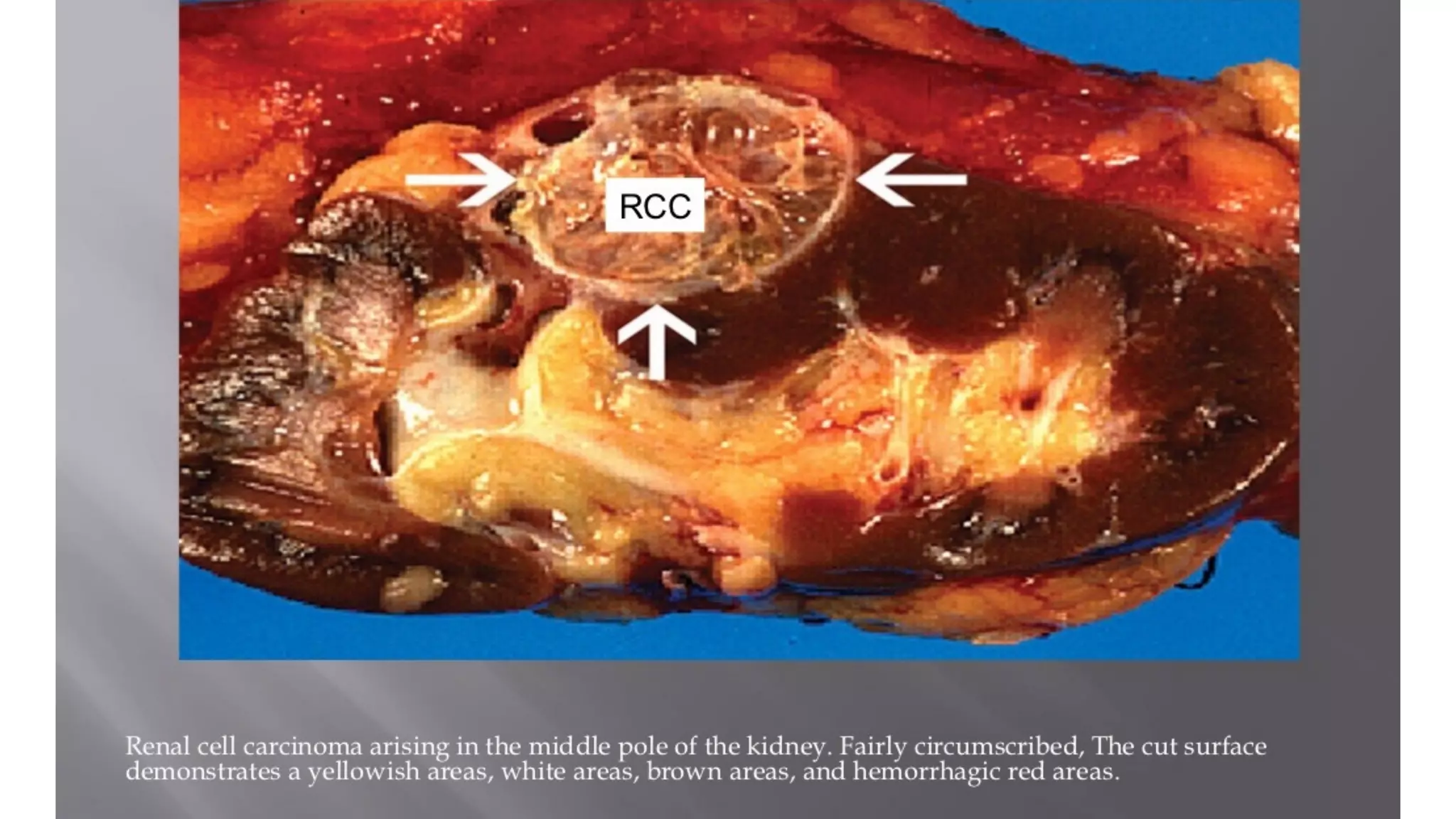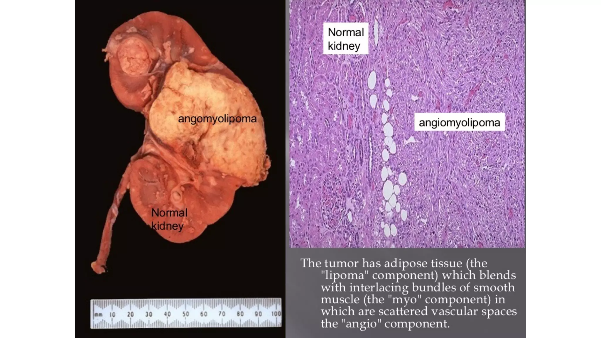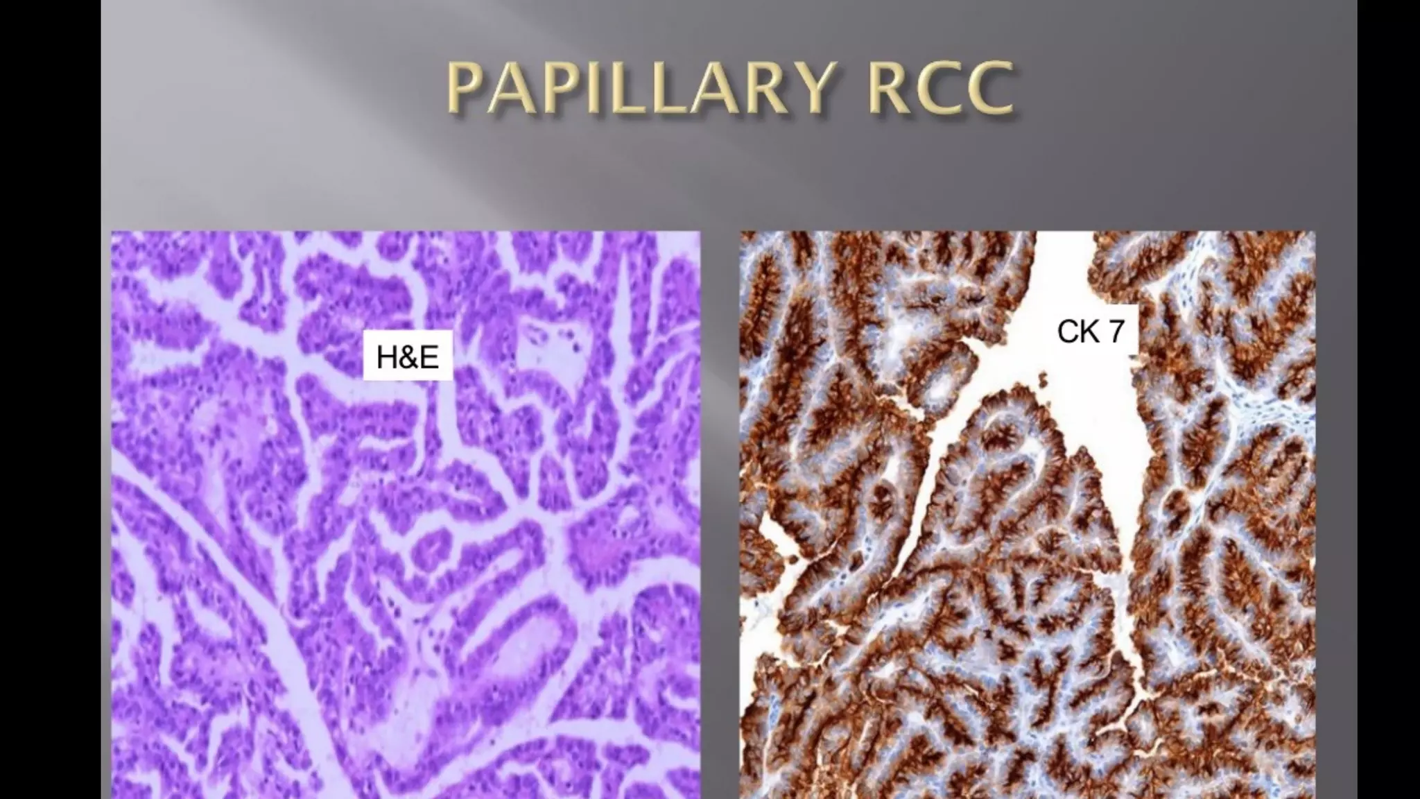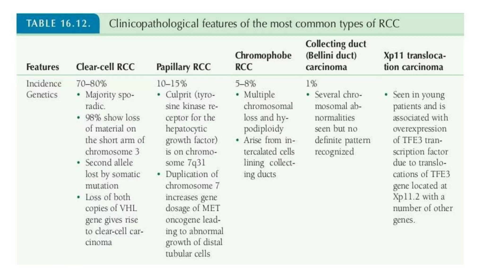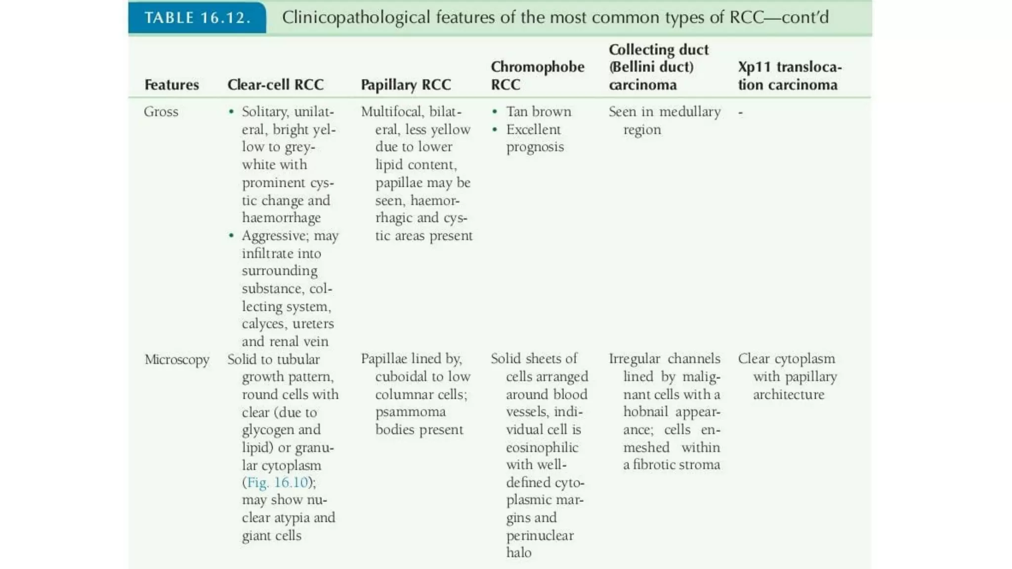 The document reviews the pathology of kidney tumors, detailing both benign tumors like angiomyolipoma and oncocytoma, as well as malignant tumors such as renal cell carcinoma and Wilms tumor. It discusses the characteristics, genetic factors, and risk factors associated with renal tumors, highlighting the clinical features and morphology of each type. Additionally, it poses a clinical case and related questions to test understanding of the content.