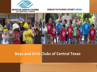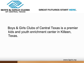 Boys & Girls Clubs of Central Texas is a youth enrichment center located in Killeen, Texas, offering programs such as child care, tutoring, youth football, and various recreational activities. Their services focus on character leadership, education, health, the arts, and sports, aimed at helping children build confidence and discover their talents. For more information, they can be contacted at (254) 699-5808 or visited online at www.bgctx.org.