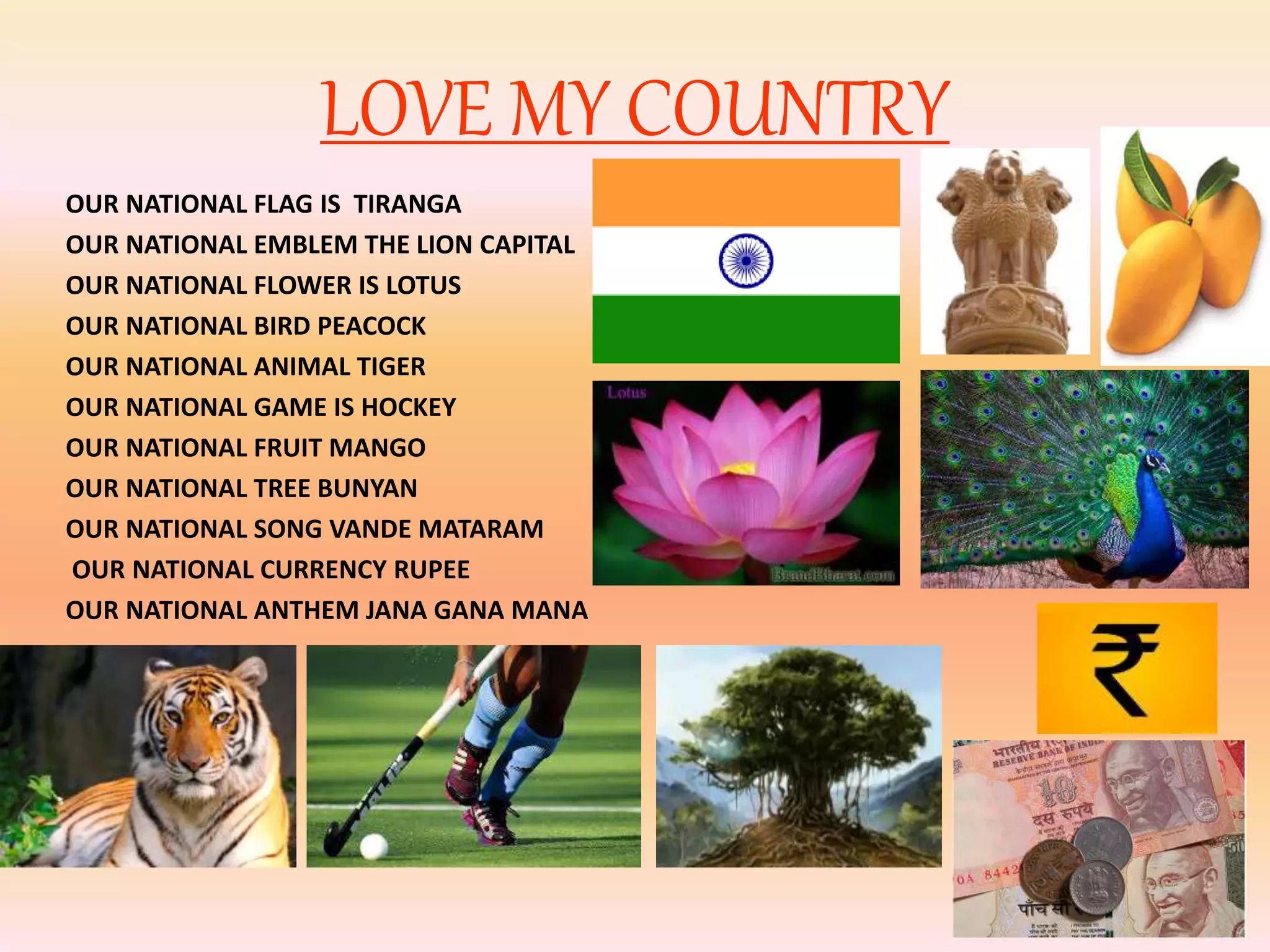The document provides information about India's national symbols, landforms, good habits, animal sounds, dog breeds, and internal organs. It lists the national flag as tricolor, national emblem as Lion Capital, and national flower as Lotus. It describes landforms such as mountains, hills, rivers, sea and desert. It discusses good habits like using kind words, thanking and greeting people, and not wasting food or water. It also identifies the homes of different animals and the sounds made by various animals. Furthermore, it shares facts about small dog breeds and the functions of organs like the lungs, kidneys, heart and brain.
