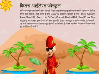 Kids Island is a unique playschool in Shahjapur for children aged 1.5-5 years that focuses on learning through fun and play. It aims to provide a safe, stimulating environment to support children's intellectual, physical, social and emotional growth in an atmosphere of love and care. The playschool has facilities like classrooms, an auditorium, a school bus, and areas for activities like