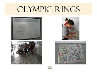 This document discusses several key symbols and elements of the Olympic Games including the Olympic rings, the Olympic torch, Olympic medals, incorporating the Olympics into physical education classes, and Olympic mascots.