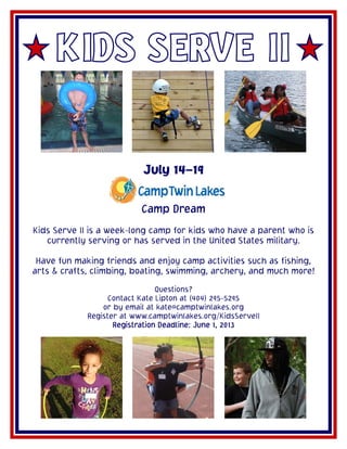Camp Dream Kids Serve II is a week-long camp for children of military parents, featuring activities like fishing, arts & crafts, and swimming. Participants can make friends and enjoy various camp experiences. For questions or registration, contact Kate Lipton or visit the camp's website, with a registration deadline of June 1, 2013.