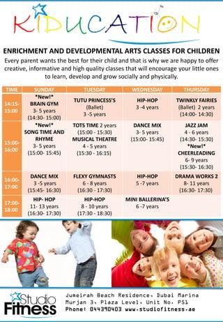 This document provides a schedule for enrichment and developmental arts classes for children offered on Sundays, Tuesdays, Wednesdays and Thursdays. The schedule lists the class names for different age groups, along with time slots. The classes include ballet, jazz, hip hop, drama, musical theatre, gymnastics, dance and more. The goal is to encourage children to learn, develop and grow socially and physically through creative and high-quality classes.
