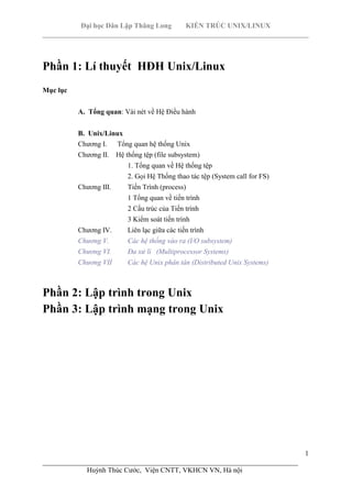 Tài liệu trình bày tổng quan về hệ điều hành Unix/Linux, bao gồm lý thuyết, hệ thống tệp, tiến trình, liên lạc giữa các tiến trình và lập trình trên hệ thống này. Unix/Linux được thiết kế để quản lý tài nguyên máy tính hiệu quả và cung cấp giao diện thân thiện cho người dùng, với nhiều loại cấu trúc hệ điều hành khác nhau như hệ đơn thể, mô hình client/server và cấu trúc theo lớp. Các đặc điểm nổi bật của Unix bao gồm tính khả chuyển, khả năng đa người dùng, và cấu trúc hệ thống tệp dễ sử dụng.