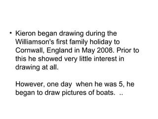 Kieron Williamson is a young British artist who began drawing at age 5 when on holiday in Cornwall, England. By age 8 he was already holding successful art exhibitions, with his paintings selling out in just 14 minutes during his second exhibition in 2009, earning him over 18,000 pounds. Though he showed little interest in art before, Kieron is now considered a mini Monet or Picasso for his natural artistic talent at such a young age.