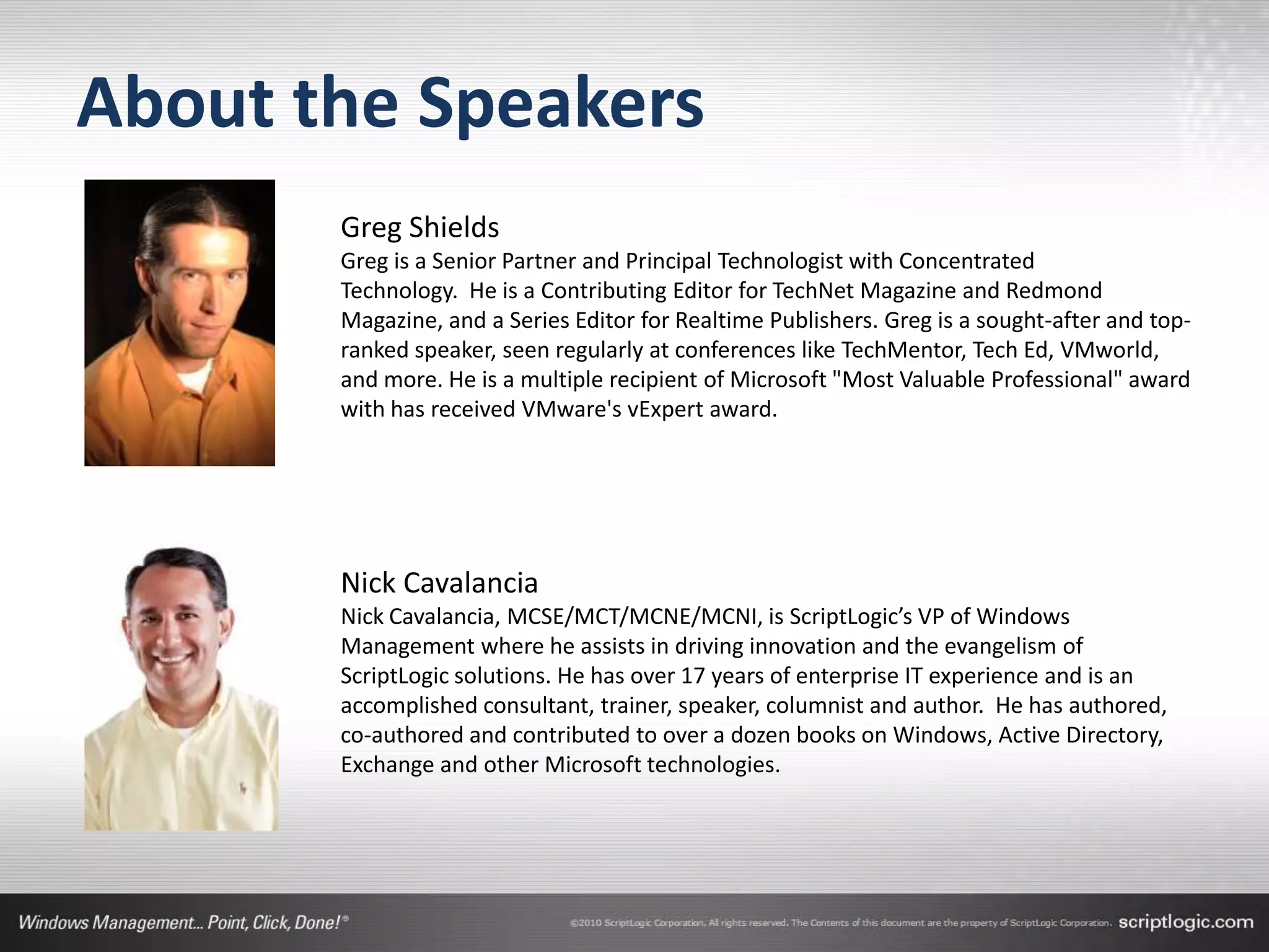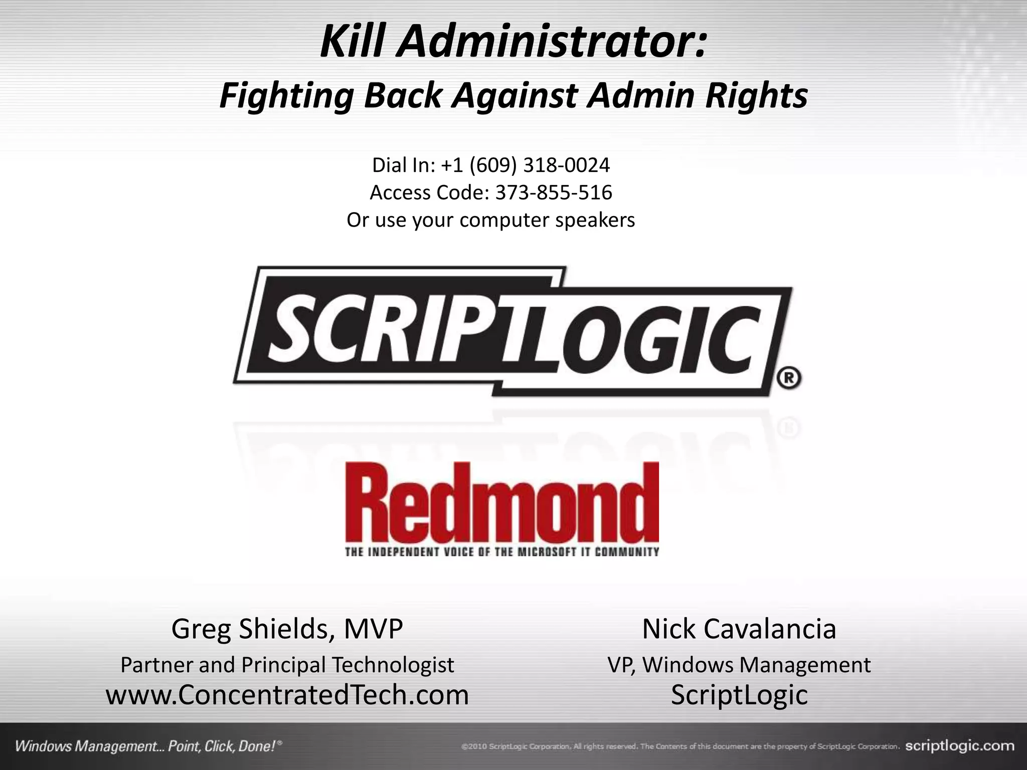 The document presents a discussion on managing administrator rights and implementing the principle of least privilege in Windows environments. It emphasizes the need for granular privilege management to address security and productivity challenges while leveraging external tools. The speakers, Greg Shields and Nick Cavalancia, highlight the importance of community support in developing effective privilege management rules and solutions.