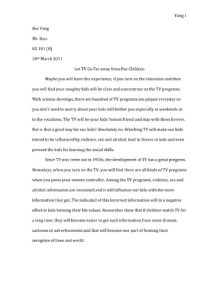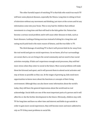 Watching too much TV can harm children in several ways. It can negatively influence their development of values through exposure to violence, sex, and alcohol in TV programs. It can also negatively impact their physical health by reducing fitness and potentially leading to obesity from lack of exercise and exposure to junk food advertising. Additionally, excessive TV watching can prevent children from gaining important social skills by interacting in the real world, which they will need to develop for healthy social and emotional functioning. While TV can provide some educational benefits, the harms of too much viewing outweigh any positives.