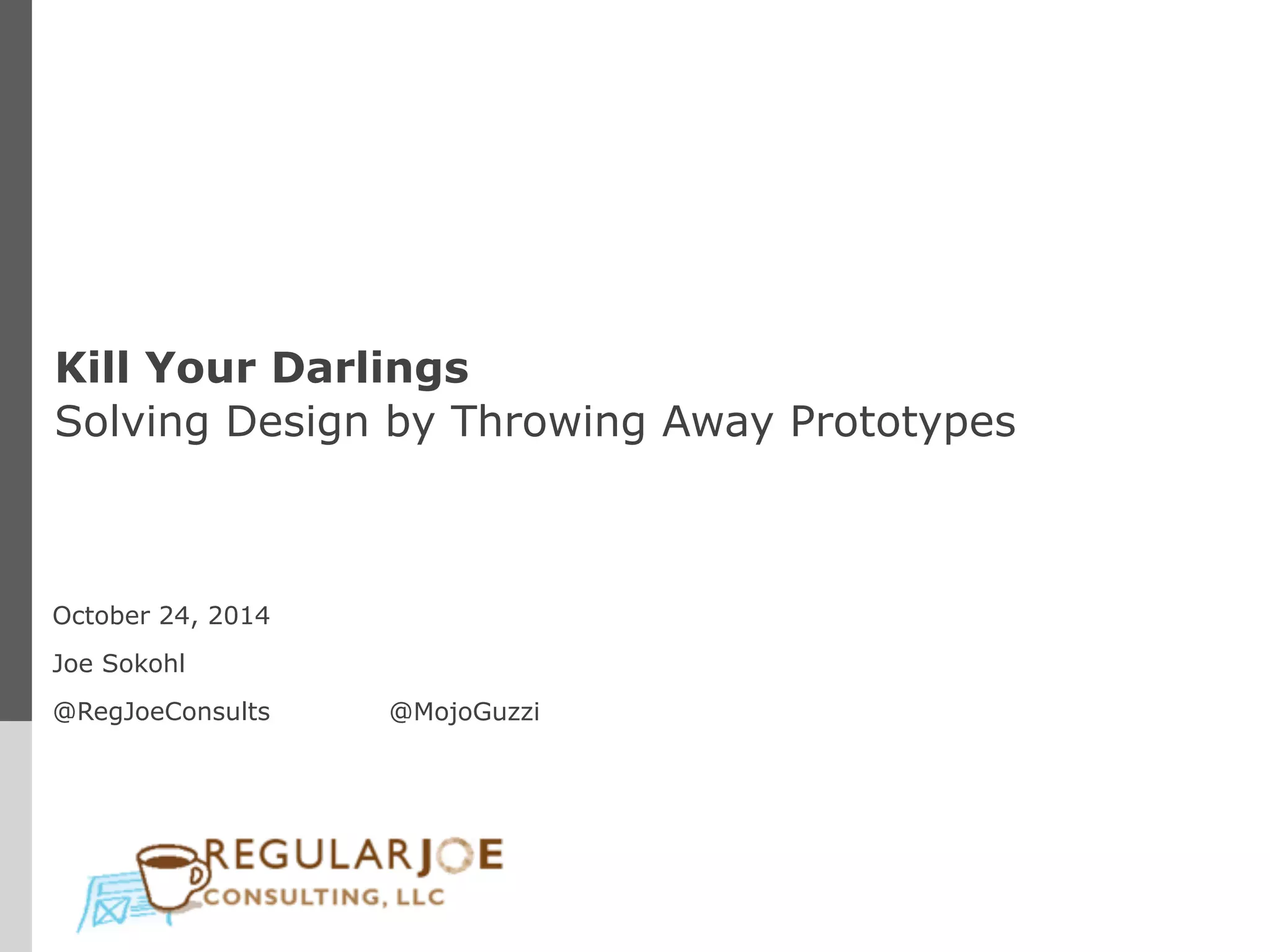 The document discusses the importance of prototyping in design, exploring both throwaway and evolutionary prototypes based on user requirements and design complexity. It emphasizes the benefits of prototyping, such as reduced risks and improved communication, while also presenting a case study on redesigning a website. The author, Joe Sokohl, shares insights on best practices for prototyping to enhance user-centered design processes.