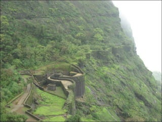 The document describes a trip to the Raigad Fort in Maharashtra, India which is 150km from Pune. It details getting lost in fog on the way, taking a ropeway to reach the top of the fort which provided beautiful views, and exploring areas like Vijay Stambh, the coronation site of Shivaji Maharaj, an ancient marketplace, Shivaji Maharaj's memorial, and the fort's main entrance before returning home.