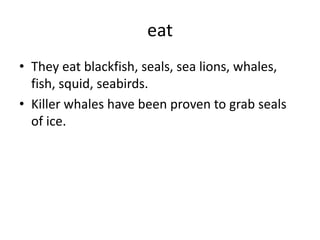 Killer whales eat a variety of marine animals including seals, sea lions, fish, squid and seabirds. They have been observed grabbing seals off of ice. Killer whales live in oceans and seas around the world.