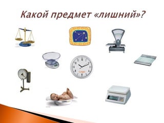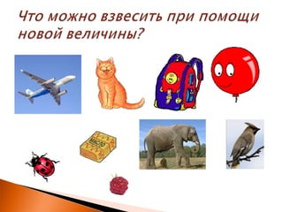 Документ объясняет понятие величины и измерения, используя примеры масс различных объектов и животных. Рассматриваются разные единицы измерения массы, такие как килограммы и граммы, и предлагаются задачи на сравнение весов. В документе подчеркивается важность понимания того, что масса является величиной, которую можно измерить и сравнить.