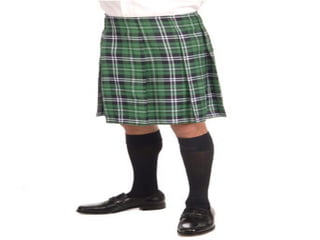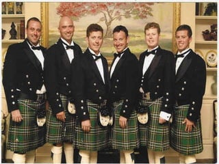 The documents provide information about the history and materials used for Irish kilts. Kilts originated as the traditional dress of men in Scotland and Ireland. Over time, they evolved from simple garments made of one piece of plaid fabric wrapped around the body into tailored outfits incorporating pleats. Modern Irish kilts are typically made from heavy wool tartan cloth, though linen was sometimes used historically.