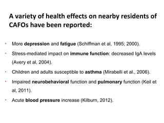 The study analyzed health outcomes in populations living in 17 North Carolina counties with concentrated animal feeding operations (CAFOs) housing over 100,000 hogs, compared to populations in 40 counties without hog CAFOs. After adjusting for demographics and socioeconomic factors, the study found higher rates of emergency department visits and hospital admissions in CAFO counties for several diseases, including infectious diseases (30% increase), respiratory diseases (20% increase), hypertension (30% increase), diabetes (70% increase), kidney diseases (30% increase), complications of pregnancy (25% increase), and epilepsy (70% increase). Mortality rates were also higher in CAFO counties for some of these conditions. The results suggest vulnerable populations like children and
