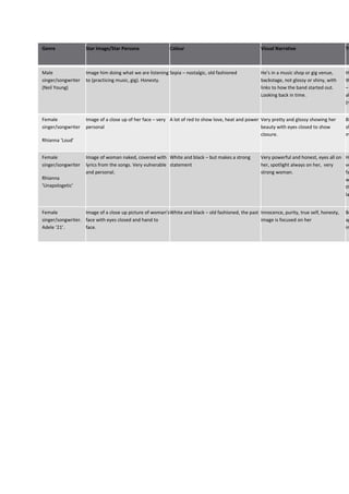 The document discusses different visual narratives and styles that could be used for album covers of various artists. For a male singer-songwriter like Neil Young, a sepia-toned image showing him practicing music or performing at a small venue would convey nostalgia and honesty. For Rihanna's "Loud" album, a close-up portrait of her face in red tones would symbolize love, passion and closure. Her album "Unapologetic" could feature an image of her naked body covered in lyrics to portray vulnerability and strength. Adele's "21" may use a black and white portrait of her face with eyes closed, communicating innocence and purity.