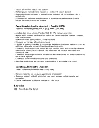 Kimberly McIntyre is seeking a senior executive assistant position and has over 13 years of experience in that role. She has worked in the credit card processing industry as an executive assistant for various companies. Her experience includes scheduling, travel arrangements, executive support, office management, and administrative tasks. She is proficient in Microsoft Office programs and is accustomed to working with minimal supervision while supporting multiple executives simultaneously.