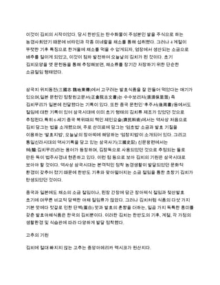 김치의 기원은 삼국시대로 거슬러 올라가야 될 만큼 오랜 역사를 가지고 있다. 인류는